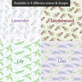 The design is a floral SANDALWOOD print. Each Wardrobe Freshener is made from scented paper and contains a fragranced mineral pouch. It is then gently scented with our SANDALWOOD fragrance, ideal for keeping your wardrobes and cupboards smelling fresh and adding some colour.