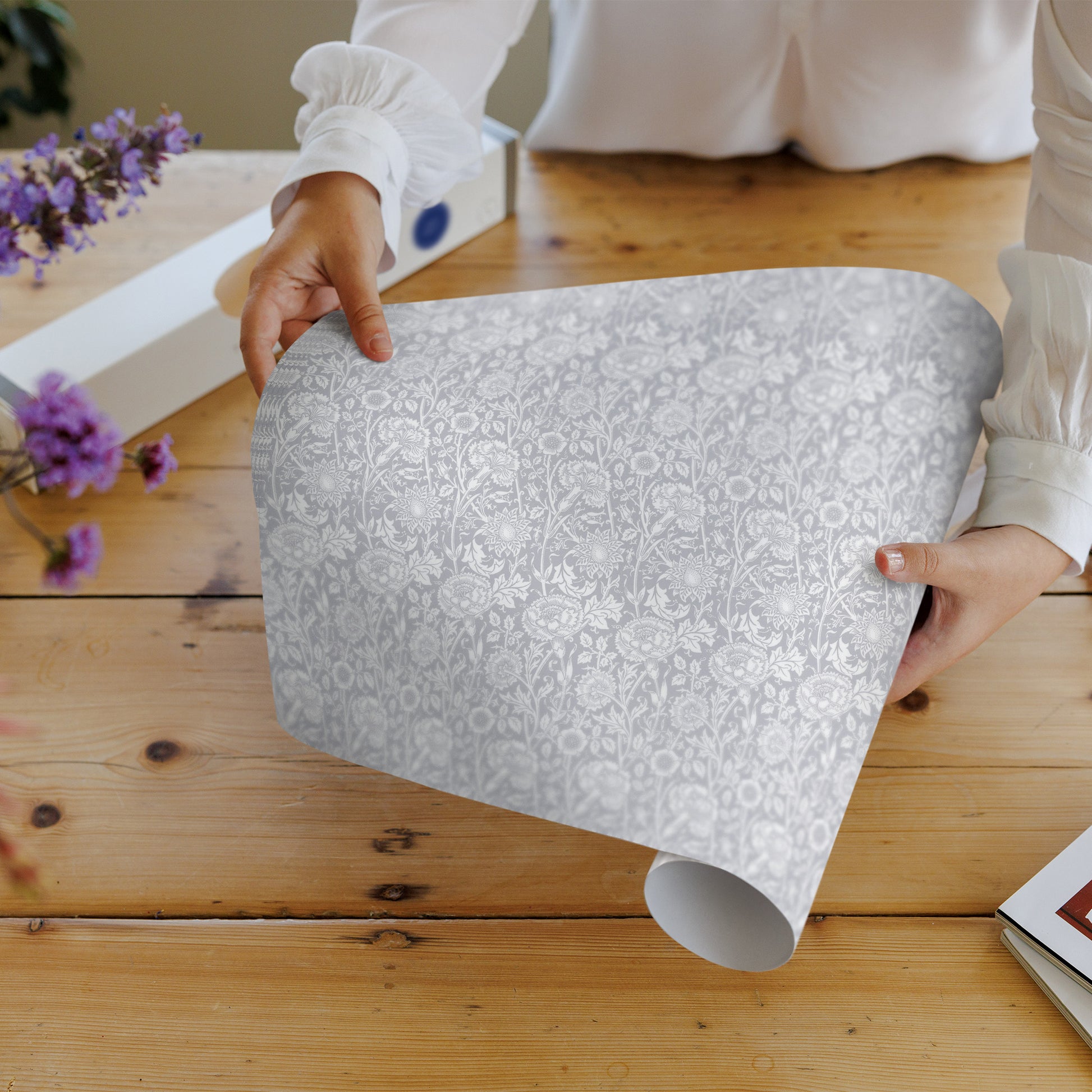 WIPE CLEAN paper allows for spillages, dust and dirt to be wiped away with a wet cloth. The high quality LAMINATED paper is robust to resist water and stains. When mess occurs, simply wipe clean with a damp cloth. The design is an elegant William Morris 'Pinks & Roses' in Soft Grey pattern.